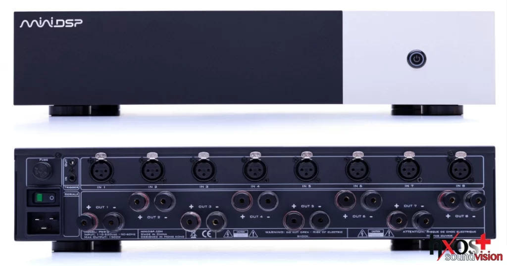 Κάθε κανάλι αποδίδει 300Wrms στα 4Ω, 150Wrms στα 8Ω. Τα χαρακτηριστικά του AMP‑8 είναι εντυπωσιακά για πολυκάναλο ενισχυτή, έχει λόγο σήματος προς θόρυβο 123 dB(A) και παραμορφώσεις THD+N: 0,0008%. Τέτοια στοιχεία μας δίνουν συνήθως σε κορυφαίοι Hi‑Fi ενισχυτές και όχι ένας πολυκάναλος όπως αυτός ο miniDSP.