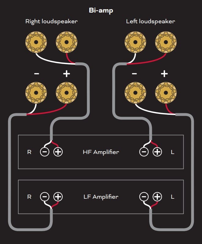 Καλό είναι επίσης να αποφεύγεται η πρόχειρη χρήση παλιών ή τυχαίων ενισχυτών που έχουμε στο σπίτι, η διπλοενίσχυση απαιτεί ακρίβεια. Σήμερα, πολλοί σύγχρονοι ενισχυτές διαθέτουν μενού ρυθμίσεων που επιτρέπουν την ανάθεση τεσσάρων πανομοιότυπων καναλιών σε Bi-Amp λειτουργία, διευκολύνοντας ιδιαίτερα την εγκατάσταση και τη σωστή κατανομή ισχύος.