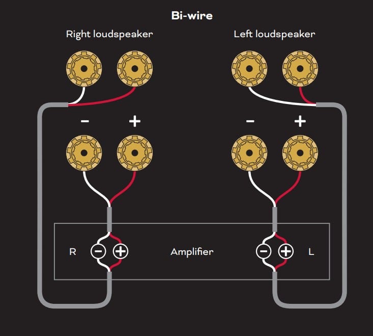Αντίθετα, όταν το ηχείο είναι σχεδιασμένο με δυνατότητα Bi-wire, διαθέτει δύο ζεύγη ακροδεκτών, ένα για τις χαμηλές και ένα για τις υψηλές/μεσαίες συχνότητες. Σε αυτή τη διαμόρφωση, χρησιμοποιούνται δύο ξεχωριστά καλώδια ώστε το σήμα να οδεύει πιο ανεξάρτητα στα επιμέρους τμήματα του ηχείου.
