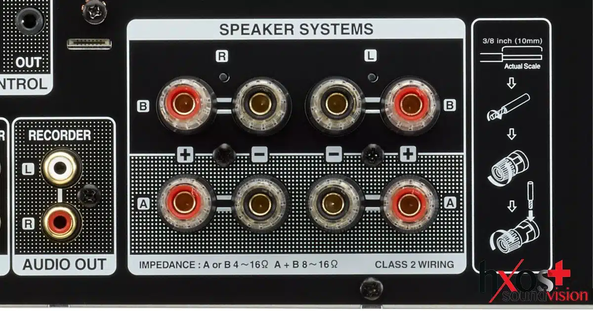 Έπειτα, συνδέουμε δύο ξεχωριστά καλώδια στους αντίστοιχους θετικούς και αρνητικούς ακροδέκτες των ηχείων και τις άλλες άκρες τους στους ακροδέκτες του ενισχυτή. Ορισμένοι ενισχυτές διευκολύνουν αυτή την εφαρμογή, προσφέροντας δύο ζεύξη εξόδων ηχείων.