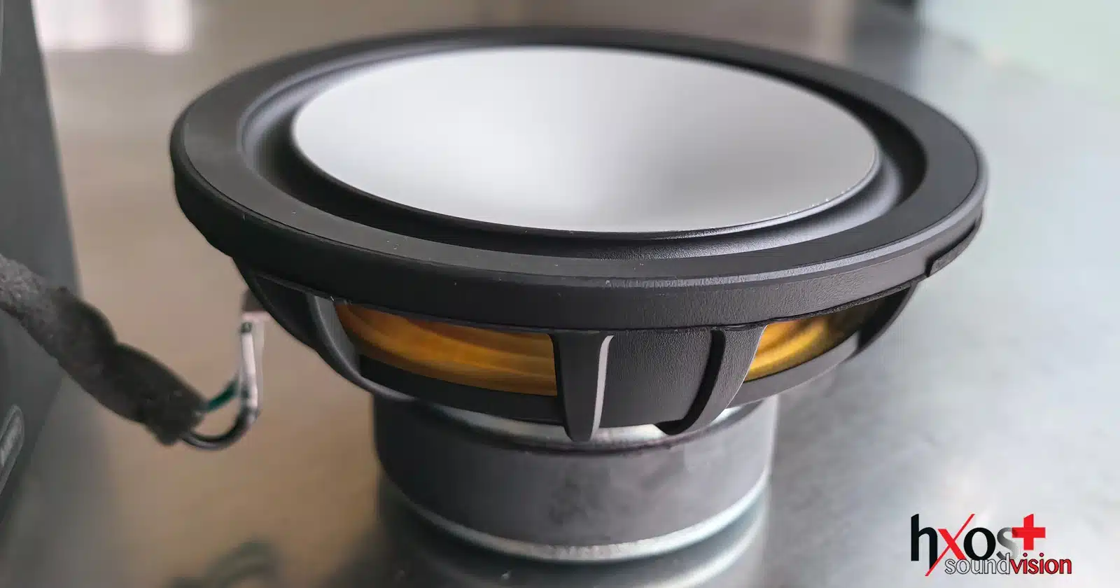 To γούφερ του 50 μοντάρεται σε αυτήν χωρίς βίδες, με μακριά ντίζα (bolt through) που βιδώνει στον μαγνήτη του και εδράζεται στην πλάτη του ηχείου, όμως είναι αθέατη καθώς καλύπτεται από το πλαστικό πάνελ με τα τέσσερα βύσματα. Δεν είναι λοιπόν κακή ιδέα μια-δυο φορές τον χρόνο να αφαιρείτε το πάνελ για να δείτε αν η ντίζα χρειάζεται σφίξιμο, όπως είναι η πάγια συμβουλή της εταιρίας για τα μοντέλα με φανερές ντίζες στις καμπίνες τους.