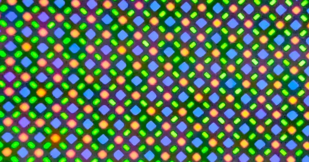 Η παρουσία έντονων κόκκινων, πράσινων και μπλε sub-pixel επιβεβαιώνει ότι το πάνελ μπορεί να αποδώσει πλούσιο χρωματικό εύρος, πλήρως συμβατό με τις δυνατότητες 10‑bit και DCI‑P3.