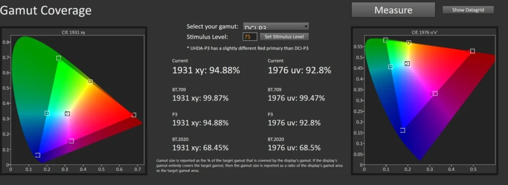 Το Color Volume επιβεβαιώνει ότι η οθόνη διατηρεί τα χρώματά της σε υψηλές φωτεινότητες, ενώ το διάγραμμα CIE 1976 δείχνει εξαιρετική επέκταση προς κόκκινο και μπλε, με σταθερό λευκό σημείο.
