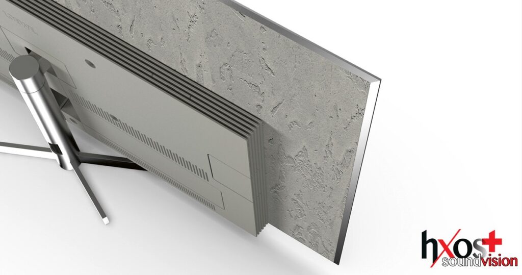Το πίσω μέρος της τηλεόρασης είναι διακοσμημένο με τσιμέντο, δίνοντας μια αίσθηση σύγχρονης βιομηχανικής πολυτέλειας. Η τραχιά υφή του τσιμέντου δημιουργεί μια απροσδόκητη αντίθεση με την υψηλή τεχνολογία της οθόνης, ενσωματώνοντας τη φινέτσα του σύγχρονου design με τη λειτουργικότητα.