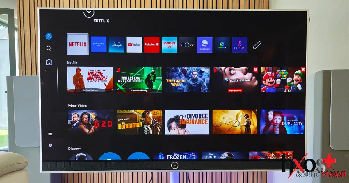 Ήταν σοφή η κίνηση της Loewe να χρησιμοποιήσει το Tizen αφού μαζί του έρχονται όλες οι εφαρμογές από Cosmote ΤV έως Ertflix, ΕΟΝ κ.ά., αλλά και το Knox ως ασφάλεια. Ακόμη και το γνωστό εφέ των τηλεοράσεων Samsung έχει, σβήνει προοδευτικά με μαύρη εικόνα τις άκρες, όπως κλείνει μια κουρτίνα.