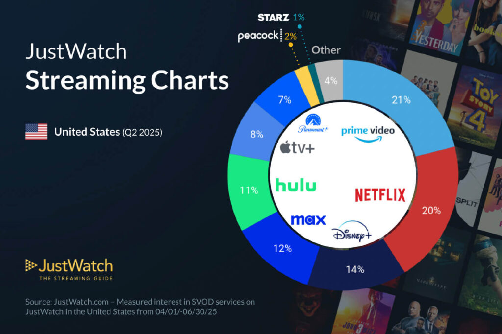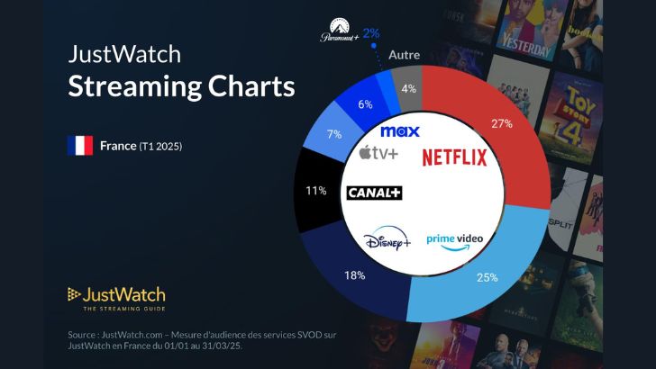 Σύμφωνα με την τριμηνιαία ανάλυση της JustWatch για το πρώτο τρίμηνο του 2025, το Netflix διατηρεί την πρωτοκαθεδρία στη γαλλική αγορά streaming, με 27% μερίδιο κοινού. Παρότι σημείωσε πτώση -1%, παραμένει στην κορυφή, αν και το Prime Video ακολουθεί με απόσταση μόλις 2 ποσοστιαίων μονάδων, φτάνοντας το 25%.