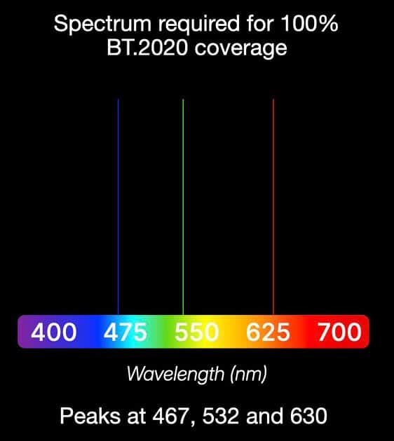 Για να επιτευχθεί 100% κάλυψη του BT.2020, οι κορυφές εκπομπής πρέπει να ευθυγραμμίζονται απόλυτα με αυτά τα μήκη κύματος. Στην πράξη, με τις τηλεοράσεις και τις οθόνες που κυκλοφορούν ή πρόκειται να κυκλοφορήσουν, αυτό δεν είναι δυνατό.